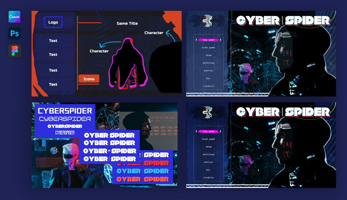 The inspiration behind Cyberspider was to create a game menu that looked "hackerish". Really drew alot of inspiration from Watch Dogs 2 and Cyberpunk with this design. I implemented hints of pink / purple hues, blurred effects, filter effects, different layered opacities and drop shadows.