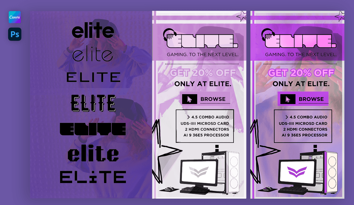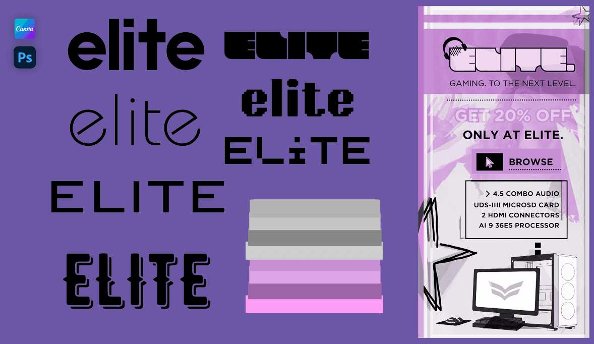 Canva: Elite logo, background, shapes, and text placement